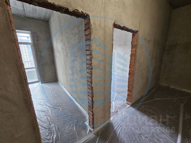 Состояние квартиры после строителей, пол стяжка, на стенах гипсовая штукатурка, ввод электрики в квартиру, установлен 2х контурный котел и сделана разводка отопления, установлена качественная входная дверь.