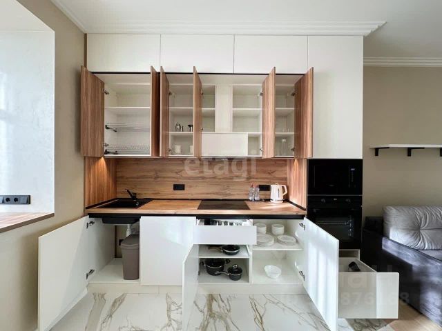 Кухня оснащена встраиваемой бытовой техникой: посудомоечная машина на 12 комплектов посуды, духовой шкаф, индукционная варочная поверхность , электрическая вытяжка, холодильник, микроволновая печь, мойка и смеситель японской фирмы "OMOIKIRI"