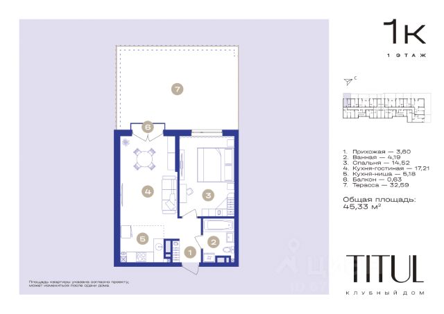 Sky" — это закрытое приватное пространство, 7-ми этажный дом клубного типа с ограниченным доступом на территорию и спокойным окружением, где атмосфера наполнена лишь шелестом листвы и пением птиц. Клубный дом "Sky" выполнен в комбинированном архитектурном стиле, сочетающем в себе гармонию классики и лучшие элементы современных жилых комплексов: панорамное остекление, увеличенные окна, французские балконы, входные группы на уровне земли и просторный подземный пакринг с прямым доступом. Завершает композицию применение натуральных материалов в отделке фасада: гранитный камень и теплый кирпич, дополненные элегантной подсветкой. Линейка планировок дома "Sky" включает в себя одно-, двух- и трёхкомнатные квартиры площадью от 46 до 125 квадратных метров с просторными балконами, лоджиями с панорамным остеклением и широкоформатными окнами с французским подоконником. Открытые пространства и высота потолков 3,1 метра позволяют вам свободно зонировать помещение, создавая персональный комфорт. Климат в квартире зависит только от ваших желаний благодаря индивидуальной и независимой системе газового отопления. Клубный дом "Sky" занимает особое место, расположившись между небом и предгорьями Большого Кавказа в тихом центре города-курорта Кисловодск в атмосфере вечнозеленых парков, свежего горного воздуха, и завораживающих видов. Благодаря особенностям рельефа и панорамному остеклению резидентам "Sky" открывается уникальная возможность любоваться открытыми видами на весь город, горные хребты и обширную вечнозеленую территорию Комсомольского парка. Дизайнерские холлы и мягкие зоны в лобби создают пространство для общения с гостями и обеспечивают рабочую атмосферу. Нет необходимости подниматься в квартиру, множество деловых и не очень встреч можно провести на первом этаже за чашкой ароматного кофе. Впрочем, если это необходимо, бесшумный скоростной лифт плавно доставит вас на нужный этаж. Больше нет необходимости оставлять автомобиль под окнами и оберегать от каждого мяча на детской площадке. Просторный подземный паркинг с организованной системой хранения обеспечит максимальную сохранность вашего авто, а попасть в квартиру вы сможете на лифте прямо с паркинга при любых капризах погоды. 1-комнатная квартира в Кисловодске.