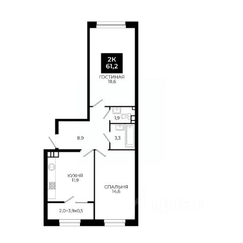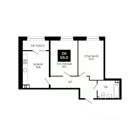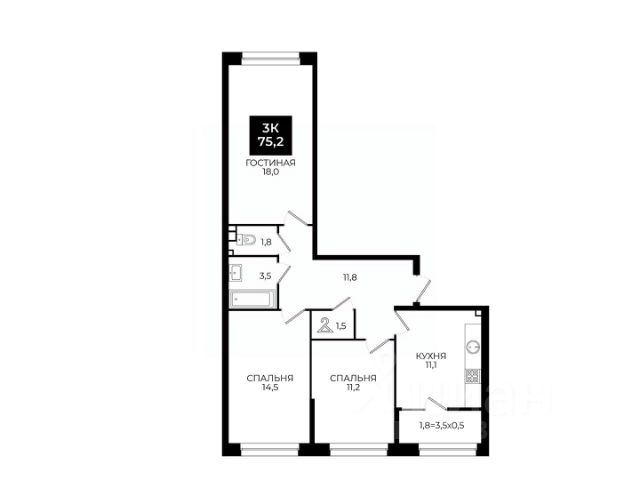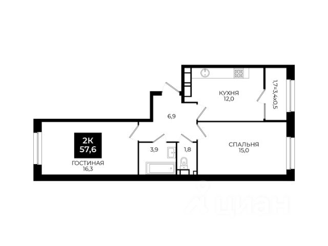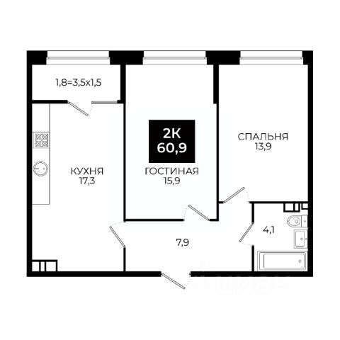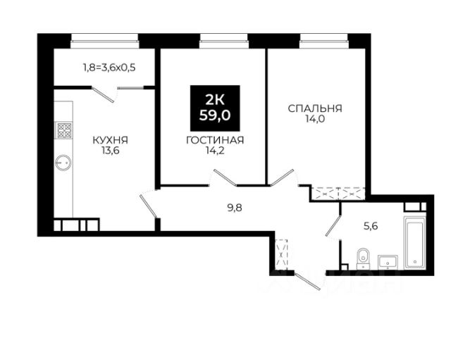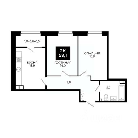 Просторная 1-комнатная квартира с кухней-гостиной и отдельной зоной для сна;