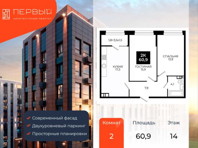 — Подземный паркинг, кладовые на этаже, скоростные бесшумные лифты;