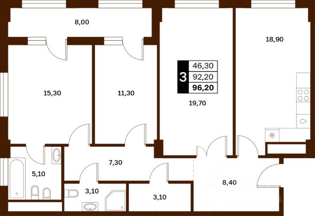 Продаётся 3-комнатная квартира в сданном доме (Серова, 468/3), срок сдачи: IV-кв. 2025, общей площадью 93.9 кв.м., на 10 этаже.
