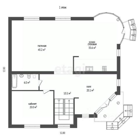 1 этаж: Гостиная с камином и кухня-столовая с выходом на террасу, санузел, сауна, гардеробная, комната.
