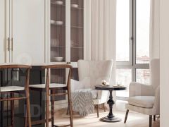 В отделке ванной комнаты, тв-зоны, фартука кухонного гарнитура использован широкоформатный итальянский керамогранит, стены покрыты краской "Little Greene, пол выложен паркетной доской.