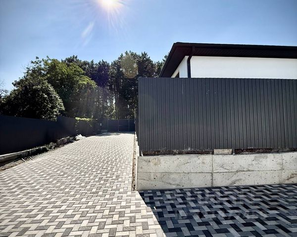 Участок благоустроен: высажен сад, газон и декоративные растения, уложены дорожки из тротуарной плитки, установлено уличное освещение.