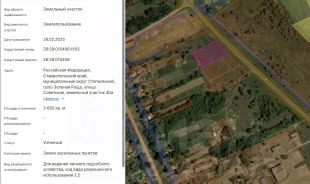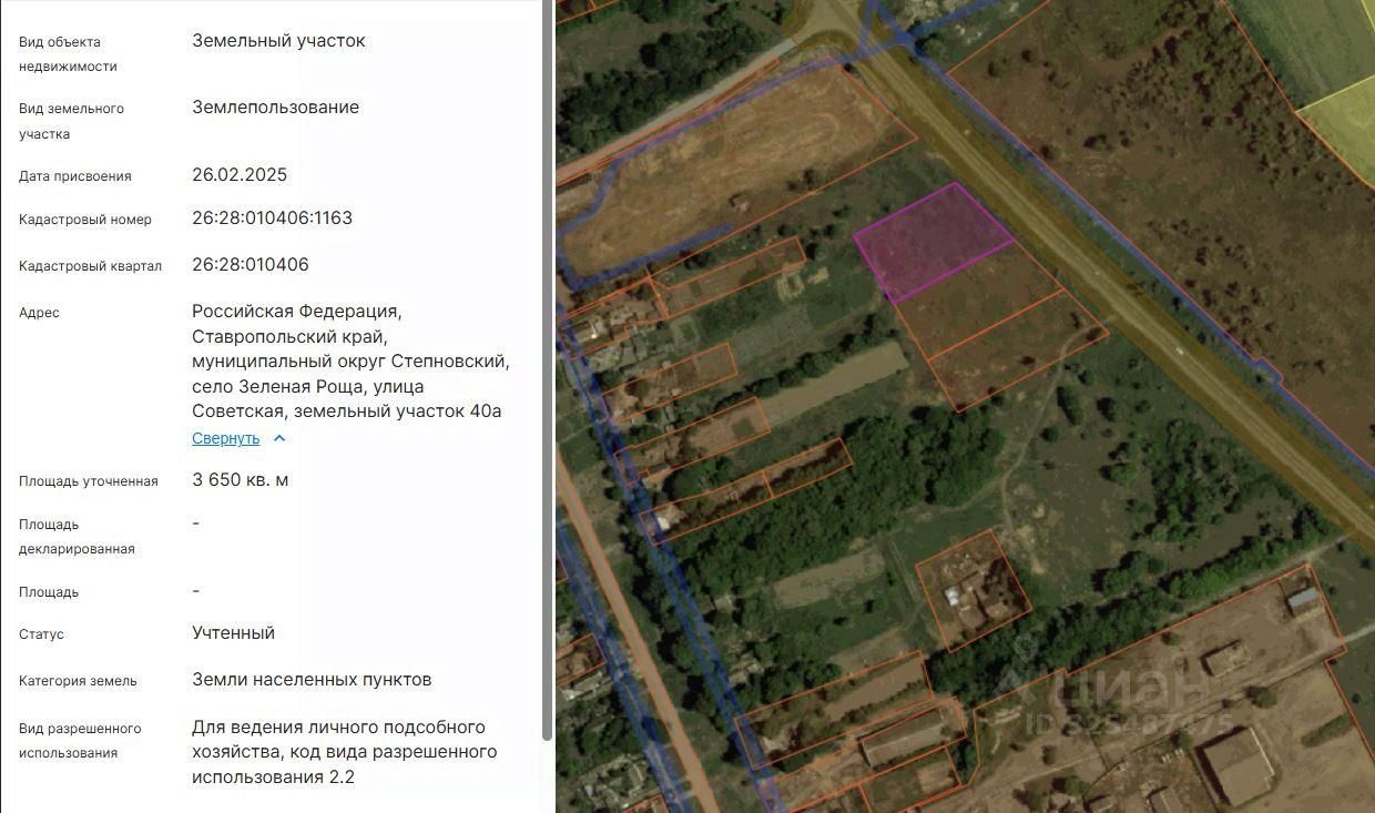 Земельный участок с кадастровым номером 26:28:010406:1163 площадью 3650 кв. м по адресу: Российская Федерация, Ставропольский край, муниципальный округ Степновский, село Зеленая Роща, улица Советская, земельный участок 40а.