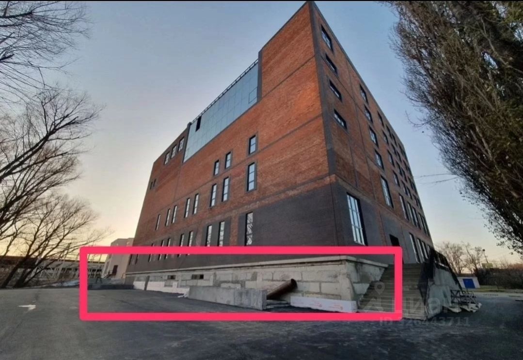 Высокий цокольный этаж (под всем зданием), с окнами.