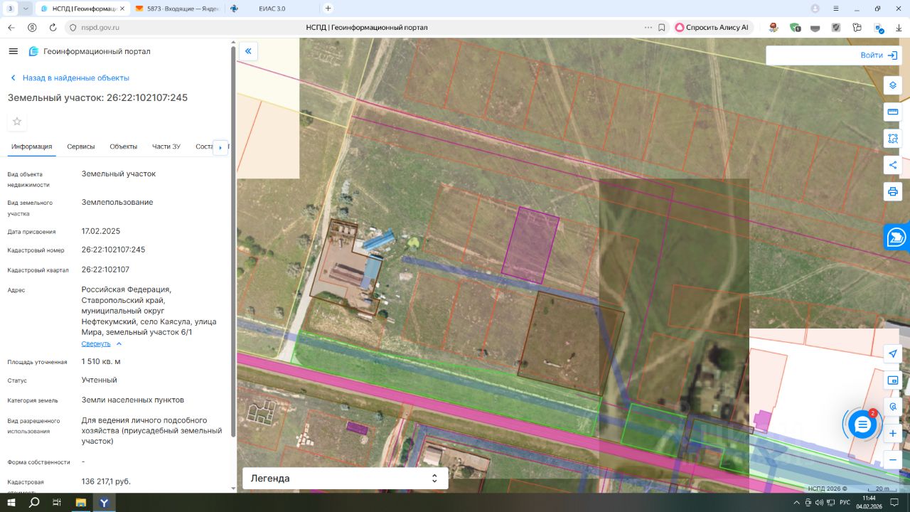 Земельный участок с кадастровым номером 26:22:102107:245 площадь 1510 по адресу Российская Федерация, Ставропольский край, муниципальный округ Нефтекумский, село Каясула, улица Мира, земельный участок 6/1
