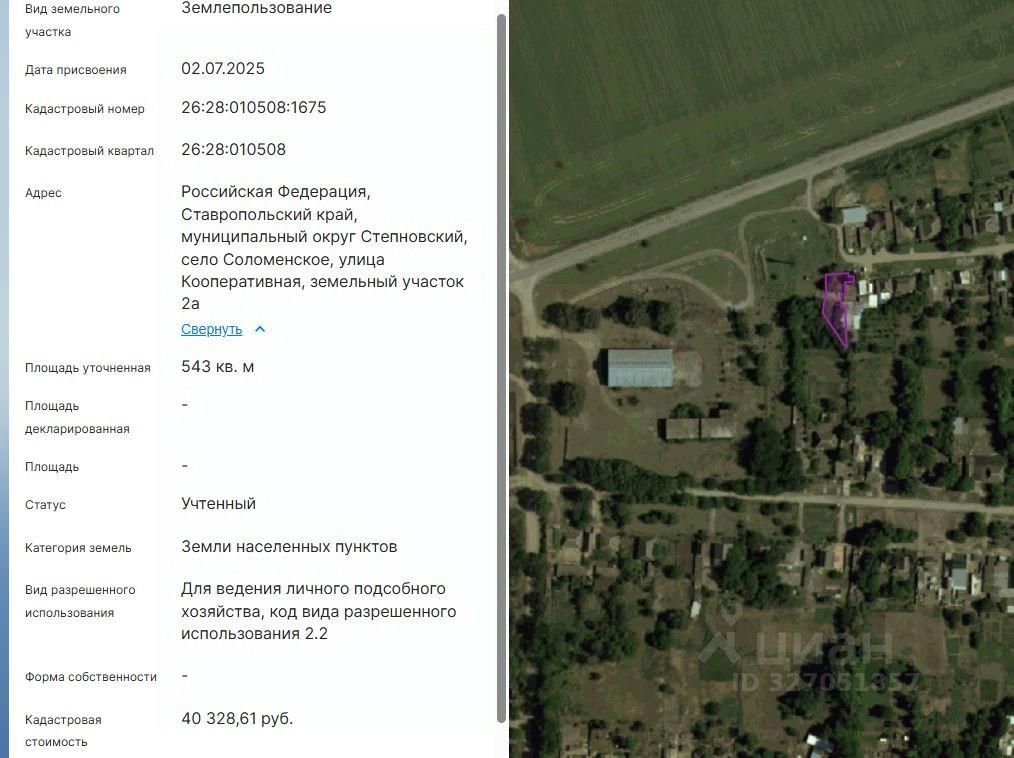 Земельный участок с кадастровым номером 26:28:010508:1675 площадью 543 кв. м по адресу: Российская Федерация, Ставропольский край, муниципальный округ Степновский, село Соломенское, улица Кооперативная, земельный участок 2а.