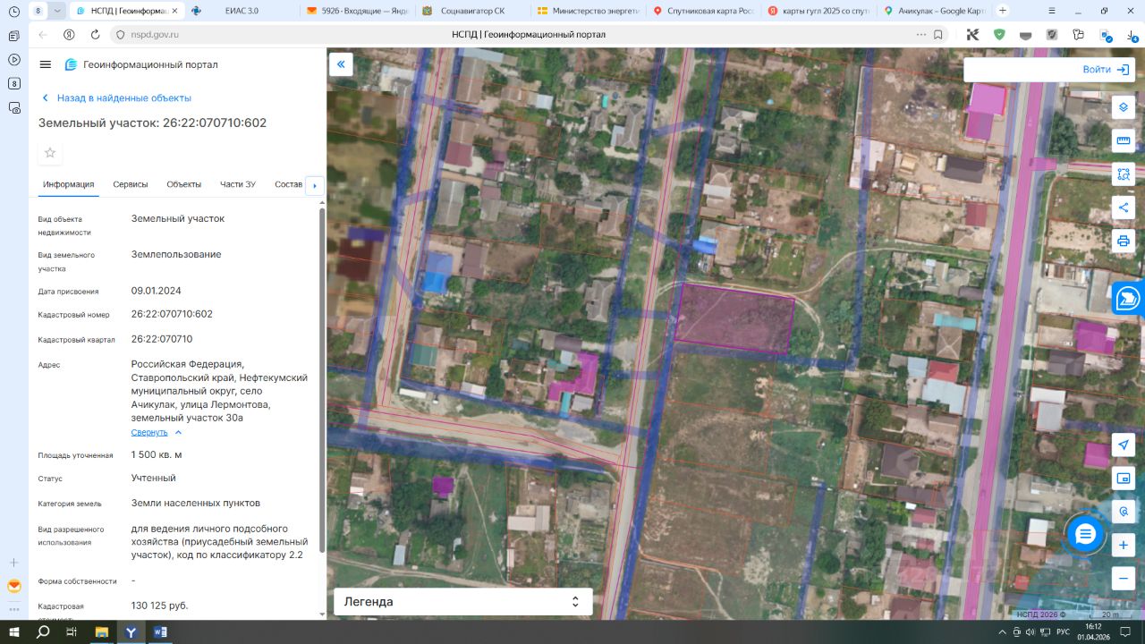 Земельный участок с кадастровым номером 26:22:070710:602 площадь 1500 кв.м. по адресу Российская Федерация, Ставропольский край, Нефтекумский муниципальный округ, село Ачикулак, улица Лермонтова, земельный участок 30а