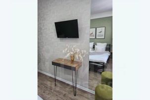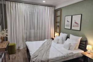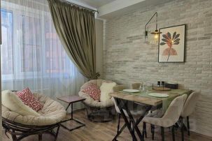 - уютная квартира 46 м2, со всем необходимым для комфортного проживания входит широкая двуспальная кровать, раскладывающийся ортопедический диван, подушки, одеяла, посуда, средства гигиены, одноразовые тапочки и полотенца;