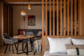 Кухонный гарнитур, двуспальная кровать, обеденный и рабочий стол.