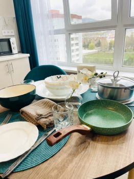 полностью оборудованная кухня: посуда, тарелки, кастрюли, сковорода;