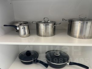 Кухня с плитой, духовым шкафом, микроволновкой, чайником, посудой.