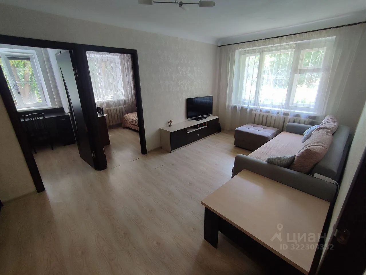 Первая комната оборудована всем необходимым для уютного отдыха: здесь установлен вместительный зеркальный шкаф-купе во всю стену, стильный двухспальный раскладной диван серого цвета, удобный пуфик, журнальный стол и современная тумба под плазменный телевизор.