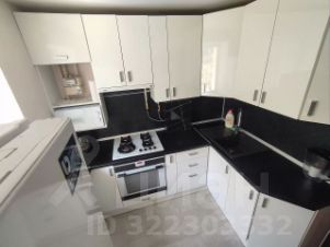 Кухня оснащена современным угловым встроенным гарнитуром белого цвета, где есть всё необходимое: двухкамерный холодильник, микроволновая печь. Для удобства жильцов установлена современная стиральная машина.