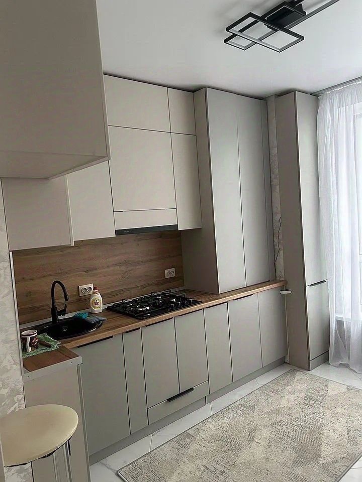 Кухня оборудована всем необходимым: установлен стильный встроенный гарнитур, предусмотрена функциональная обеденная зона. В распоряжении жильцов современный холодильник и необходимая бытовая техника, включая стиральную машину.