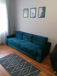 В апартаментах имеется все необходимое для комфортного проживания : кровать с комфортным ортопедическим матрасом 160*200, диван-кровать 160*200, раскладное кресло, чистое постельное белье и полотенца, постельные принадлежности (подушки и одеяла), наличие всей необходимой посуды, Wi-Fi и TV, холодильник, кондиционер, духовка, стиральная машина, микроволновая печь, электрочайник, фен, утюг, гладильная доска, сушилка, индивидуальное отопление, большой застекленный балкон, сетки на окнах.