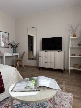 Апартаменты рассчитаны на 3 гостей (двуспальная кровать и кресло-кровать), душ, фен, гигиенический душ, полотенца, постельное белье, гигиенические принадлежности.