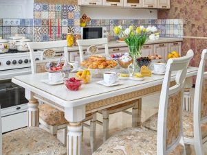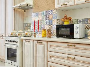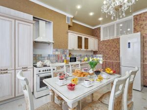 В спальне поставили большую кровать с ортопедическим матрасом, в гостиной — удобный раскладной диван. Кухню оборудовали всей необходимой бытовой техникой и полным комплектом посуды, здесь вам захочется вкусно готовить, кушать и вместе проводить время, играя в настолки, к примеру.