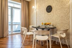В апартаментах просторную зона отдыха с мягким диваном для отдыха после насыщенного дня, полностью оборудованный кухонный уголок с бытовой техникой и посудой для приготовления любых блюд. Зона сна с удобной кроватью, мягкими качественными подушками и ортопедическим матрасом, которые обеспечат комфортный сон. Ванная комната оснащена всем необходимым. С окон открывается потрясающий вид. Оснащение: полноценная двуспальная кровать с ортопедическим матрасом повышенной комфортности 1,6м.*2м, диван -кровать 1,5* 2 м, кресло кровать 80 * 2 м, шторы Вlасk оut, Wi-Fi, телевизор SМАRТ ТV, сплит система, шкаф купе, стиральная, посудомоечная машина, холодильник, микроволновка, варочная панель, электрический чайник, чистое выглаженное постельное белье, полотенца, одноразовые тапочки, посуда, кастрюли, сотейник, турка для кофе, столовые приборы, чашки, бокалы для вина и воды, фен, гель для душа и шампунь, моющее средство для посуды, утюг, гладильная доска, сушилка для белья.