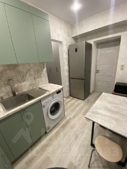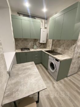 Кухня площадью 7,2 м² оборудована всем необходимым: холодильник, стиральная машина и современная плита. Просторная гостиная включает удобный диван и вместительный шкаф для хранения вещей. В спальне установлена большая кровать и шкафы.