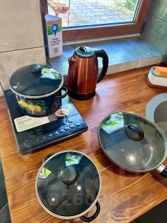 Имеется электрическая варочная панель, холодильник, микроволновка, Эл. чайник, посуда. Имеются шкафы и полочки для хранения принадлежностей. Тихий ухоженный двор, автоматические ворота, парковка.