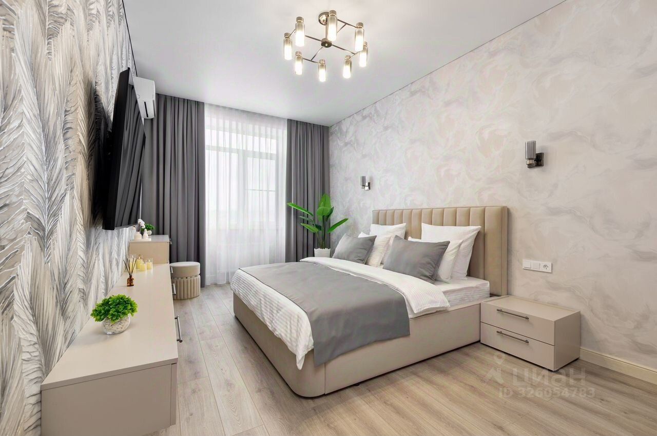 — Уютная спальня, большая кровать с ортопедическим матрасом и ТВ 65-диагонали".