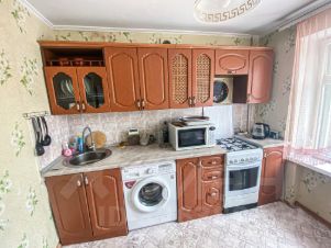 Квартира предлагает удобную кухню с гарнитуром, холодильником и стиральной машинкой, а также комфортную гостиную с угловым диваном и креслом.