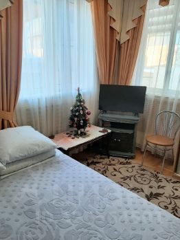 Комната большая с ТV, c двухместной и одноместной кроватями, шкаф-купе, стол, стулья.
