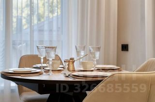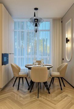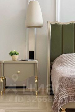 Квартира отличается высокими потолками и большими окнами, которые наполняют пространство естественным светом. Стены оформлены в теплых пастельных тонах, а элементы декора, такие как молдинги, подчеркивают классический стиль. Мебель выполнена из качественных материалов и гармонично вписывается в общий интерьер.