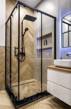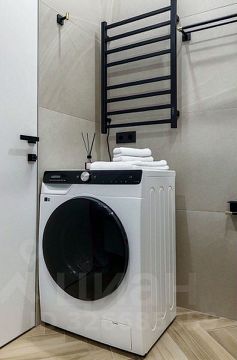 Санузел: Современный санузел с душевой кабиной, унитазом, раковиной и стиральной машиной. Использованы качественные отделочные материалы.