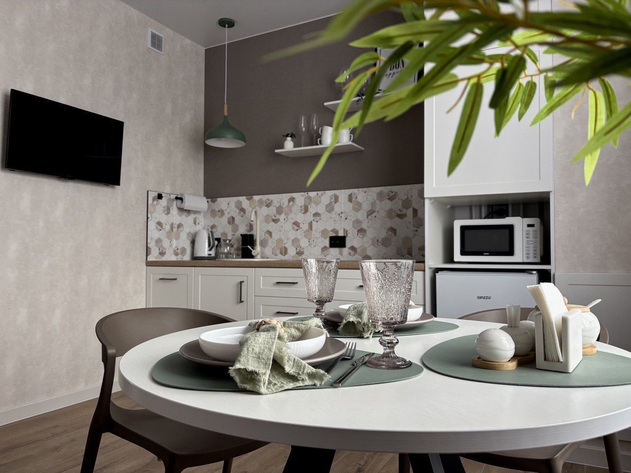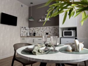 2 кухонных зоны со всей необходимой техникой: посудомоечная машина, плита, микроволновая печь, чайник, холодильник, посуда и столовые приборы. Утюг, гладильная доска, напольная сушилка, постельное белье, полотенца, средства личной гигиены (шампунь, гель для душа).