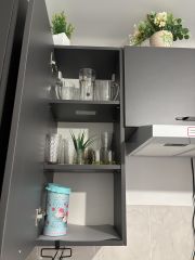 В кухонной зоне: микроволновая печь, плита, холодильник, чайник, посуда и столовые приборы на любой случай.