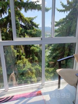 Великолепный вид на горы с панорамного балкона, за которым сосны.
