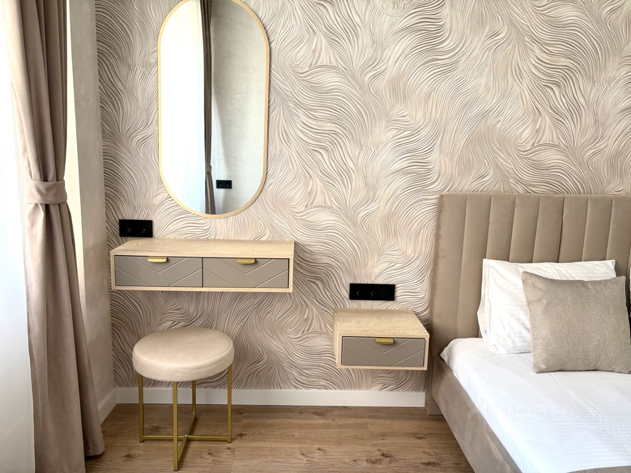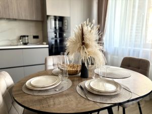 Эта просторная квартира идеально подходит для комфортного проживания. В ней имеется отдельная спальня ( двуспальная кровать ) и современная кухня-гостиная ( 2 раскладных дивана по 150-160 см ) полностью меблированная и укомплектованная всем необходимым. В квартире есть: