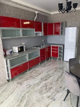 - Кухонный гарнитур, газовая плита, микроволновая печь, холодильник, чайник, посуда для приготовления и сервировки еды.
