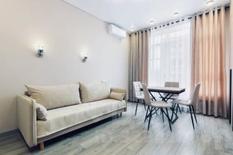 - Кухня-гостиная (раскладной диван, обеденный стол + стулья, ТВ, кондиционер)