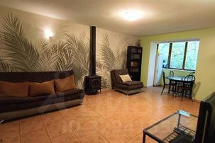 Гостиная: дровяной камин, двуспальный раскладной диван, большой обеденный стол, 4 стульев, детский стульчик, стеклянный журнальный столик, телевизор.