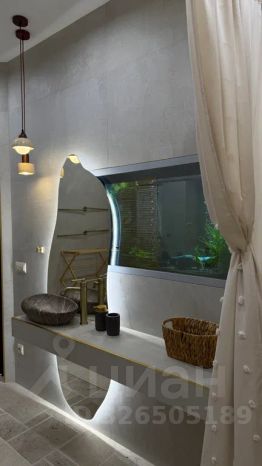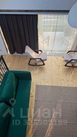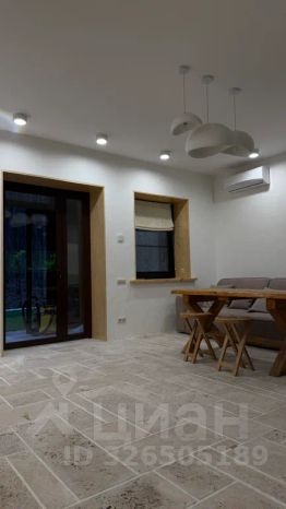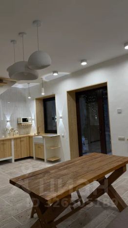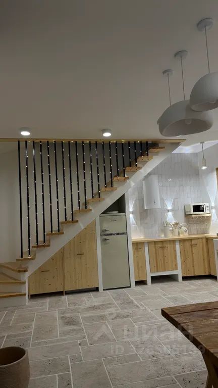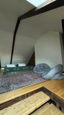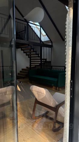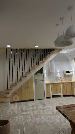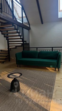 На первом этаже кухня с обеленной зоной и большим раскладным диваном, ванной комнатой