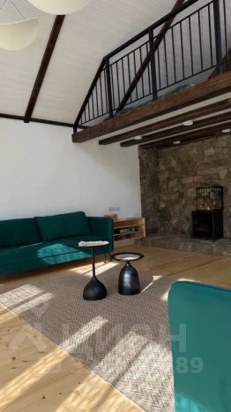 На втором этаже гостиная с выходом на балкон и камином: два двуспальных дивана, душевая комната
