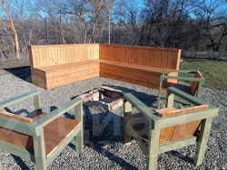 Деревянный стол и уютная костровая зона для вечерних посиделок.