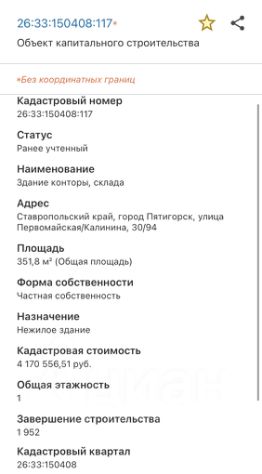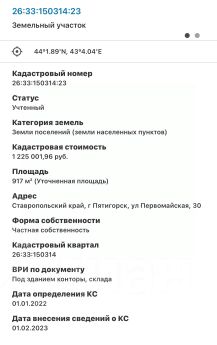 В центральной части г. Пятигорска, продается, земельный участок 917 м², с нежилым зданием, площадью 351 м ². Здание и земельный участок в собственности. Размер земельного участка: длина по фасаду 65 метров, ширина 14 метров. Кадастровый номер 26:33:150314:23.