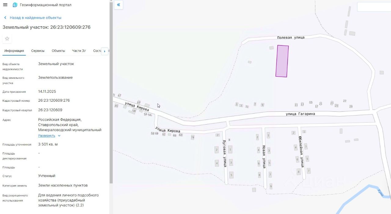 земельный участок с кадастровым номером 26:23:120609:276. Адрес (описание местоположения): Российская Федерация, Ставропольский край, Минераловодский муниципальный округ, село Долина, улица Полевая.