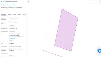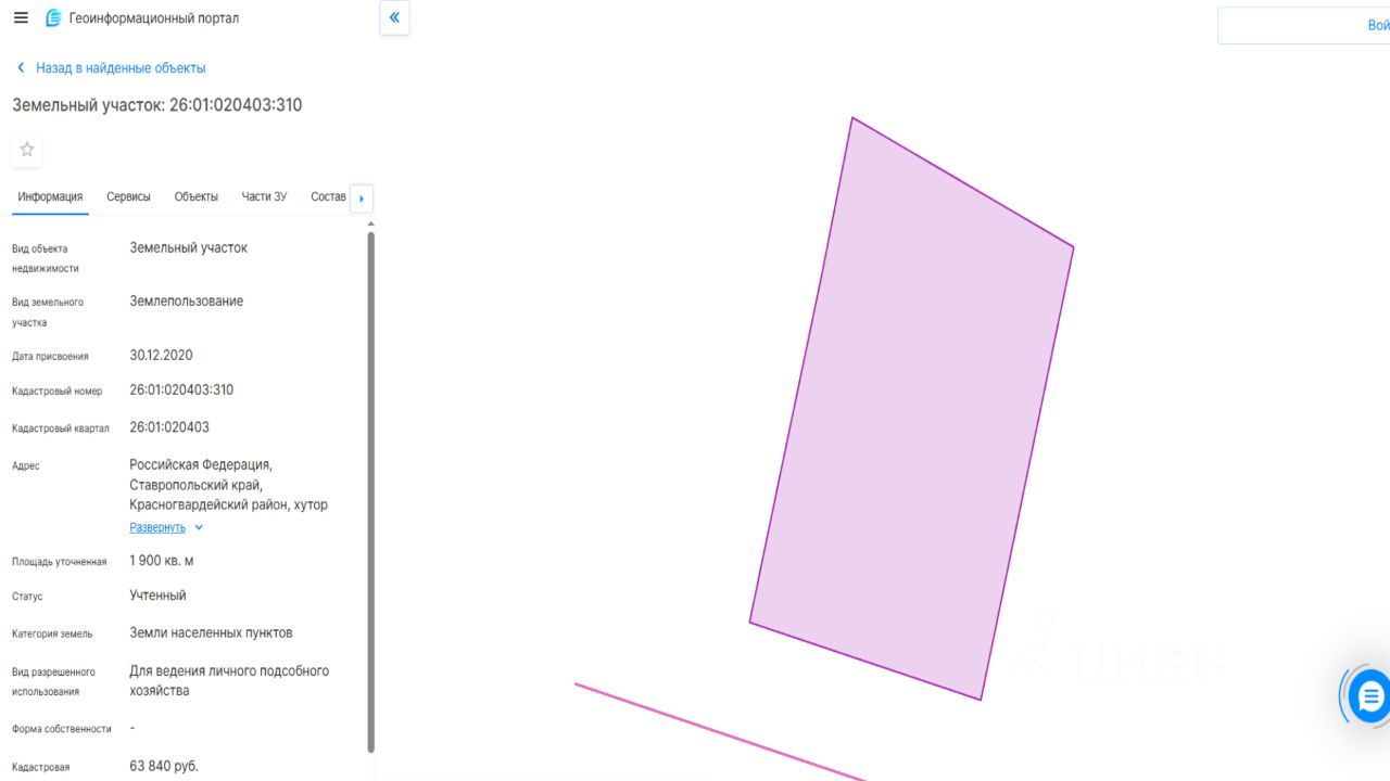 Кадастровый номер: 26:01:020403:310, категория земель: земли населенных пунктов, площадь: 1900 кв. м, вид разрешенного использования: для ведения личного подсобного хозяйства, местоположение: Российская Федерация, Ставропольский край, Красногвардейский район, хутор Средний, улица Южная, цель использования: для ведения личного подсобного хозяйства