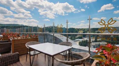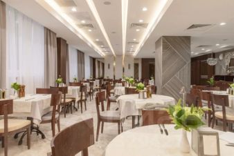 В составе объекта работают два ресторана, включая панорамный ресторан на 9 этаже — единственный в Кисловодске с видом на Эльбрус и горы. Также доступен room service и диетическое питание, разработанное специалистами.