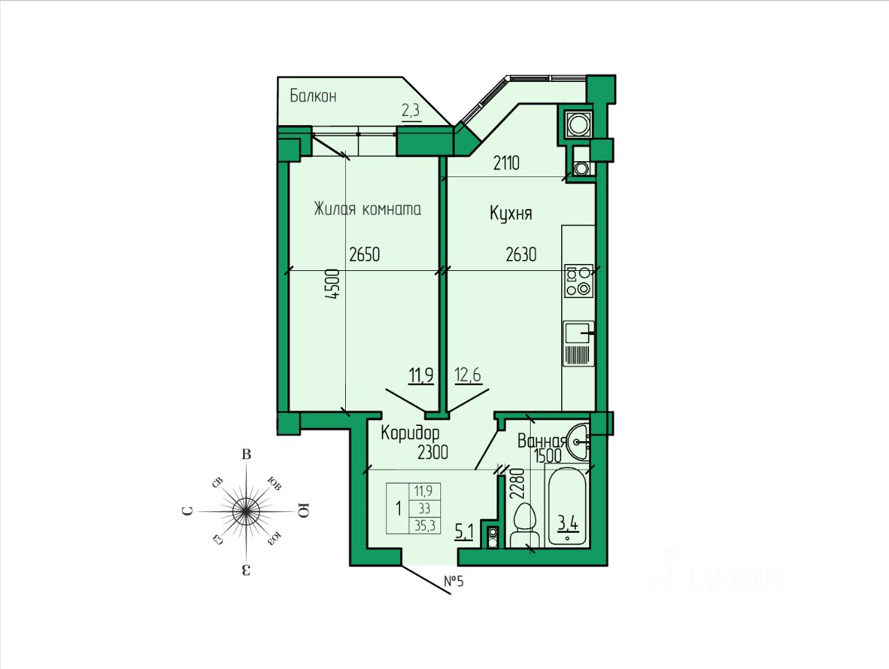 Общая площадь35,3 м²