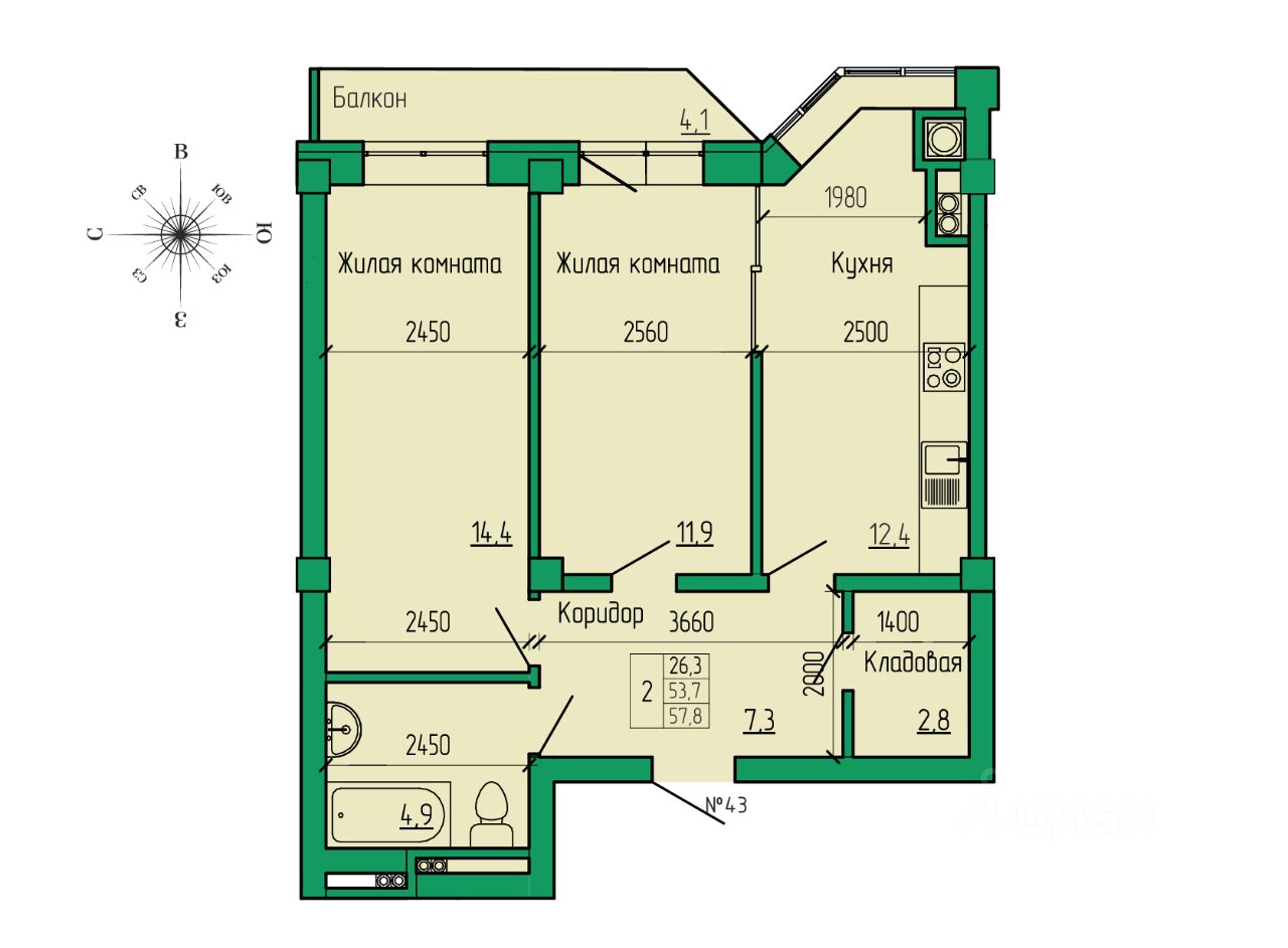 Общая площадь57,8 м²