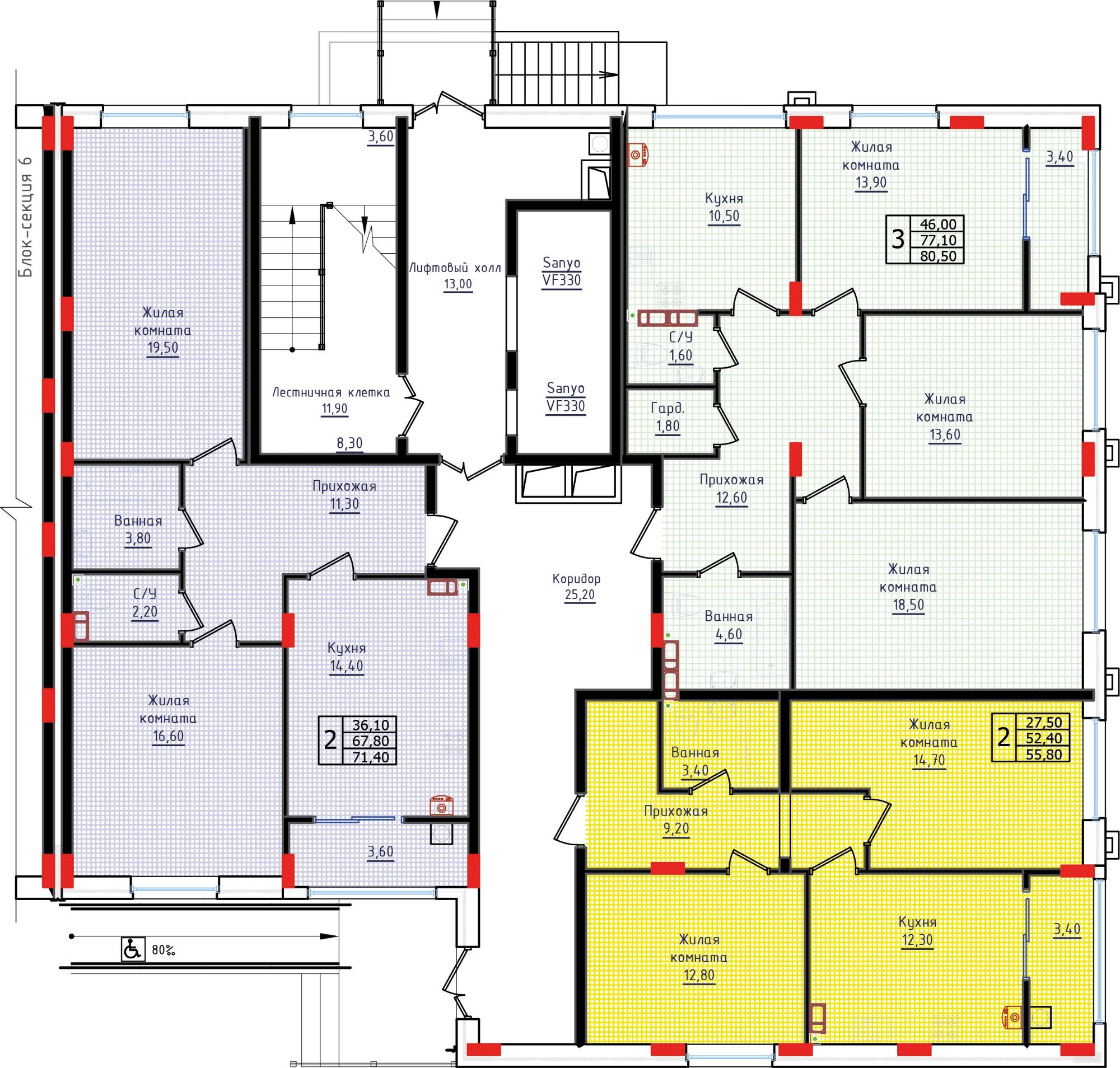 В новых проектах мы увеличили количество машино-мест (104) и разместили здесь кладовые помещения