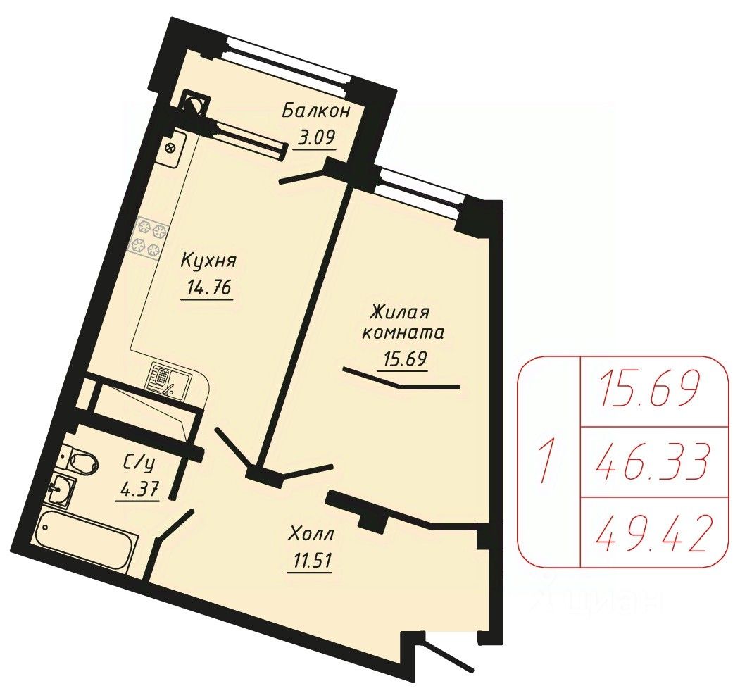 Продаётся 1-комнатная квартира в строящемся доме (Секции 6-10), срок сдачи: II-кв. 2028, общей площадью 49.42 кв.м., на 6 этаже.